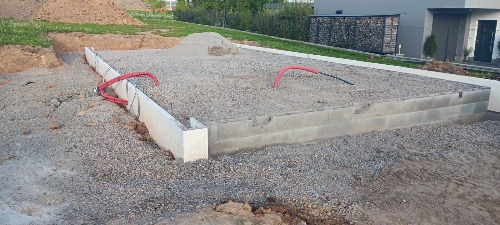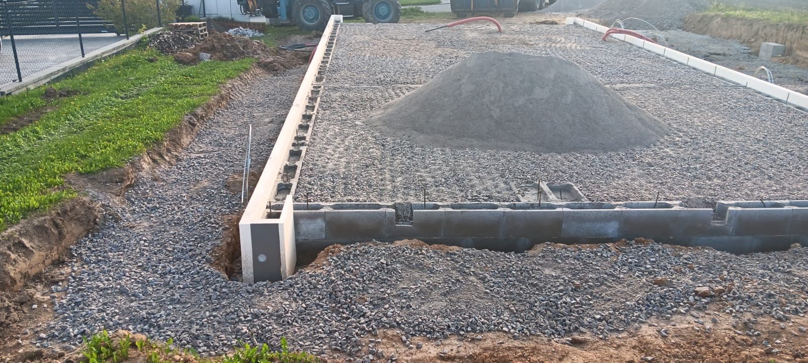 Po vytvrdnutí betonu jsme pokračoval v přípravě základů rodinného domu. Nákladní vůz na místo dovezl štěrk o velké a následné malé frakci, který jsem postupně pomocí další stavební mechanice rozvrstvil ve vymezené ploše základů. Přesun nejen stavebních materiálů mi totiž také není cizí. Nakonec následovalo hutnění základové desky, čímž má práce na této stavbě skončila.